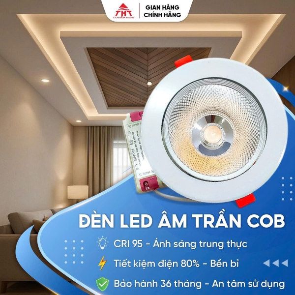 Sử dụng đèn LED âm trần COB giúp tối ưu hiệu quả chiếu sáng, tạo điểm nhấn rõ ràng và tiết kiệm điện năng. Đây là giải pháp chiếu sáng phù hợp cho các không gian hiện đại, yêu cầu ánh sáng tập trung và thẩm mỹ cao.