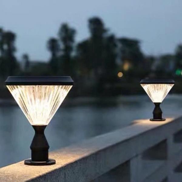Đèn LED năng lượng mặt trời: Đèn đầu cột hấp thụ năng lượng lưu trữ ánh sáng mặt trời vào ban ngày và sáng lên vào ban đêm.